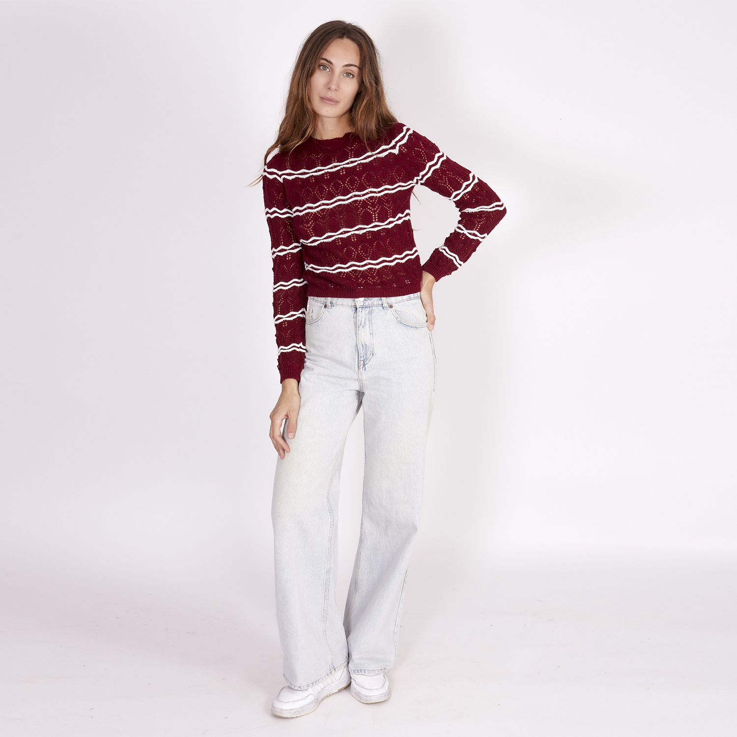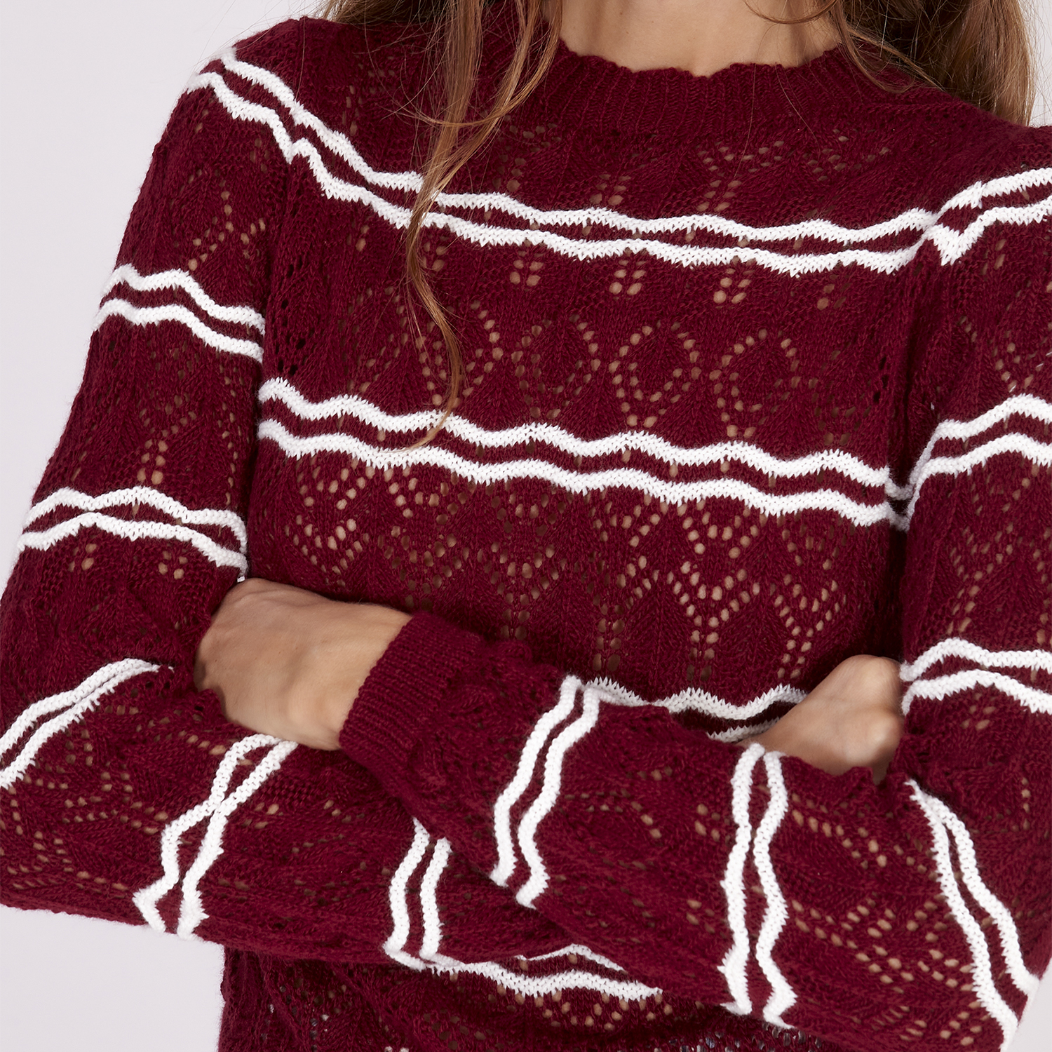 Jersey de punto con escote redondo y estampado de rayas blancas sobre rojo. Perfecto para darle a tus looks un toque de color. No olvides completarlo con algún otro articulo de la colección.