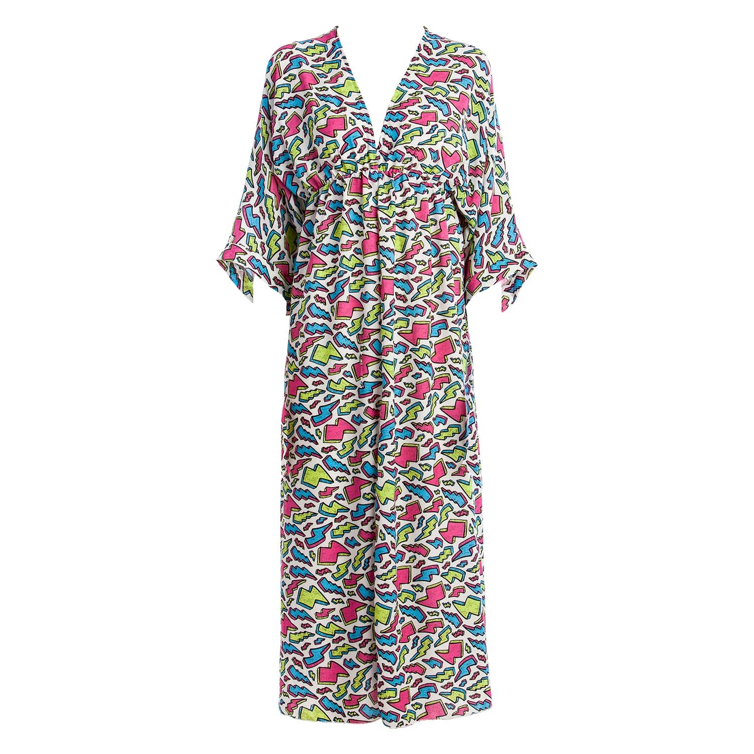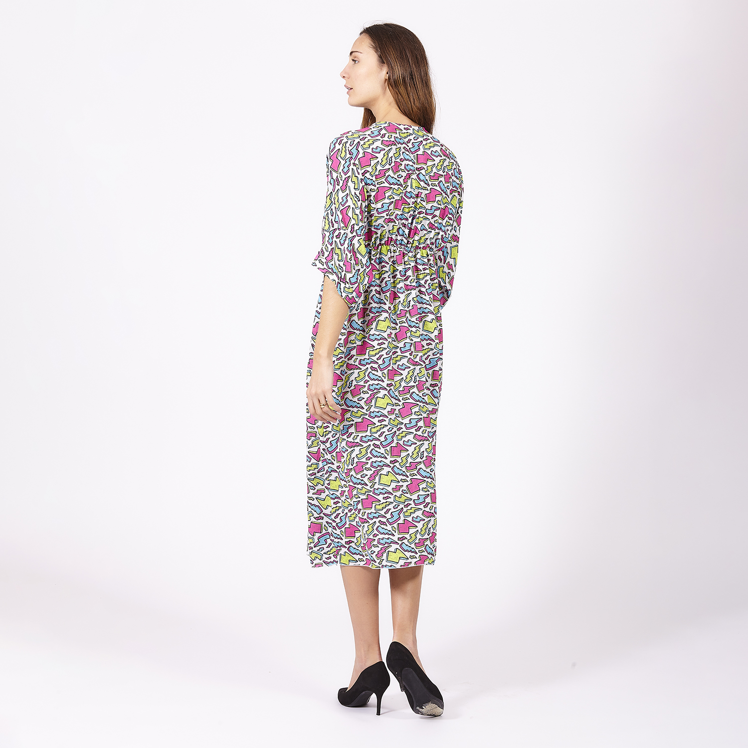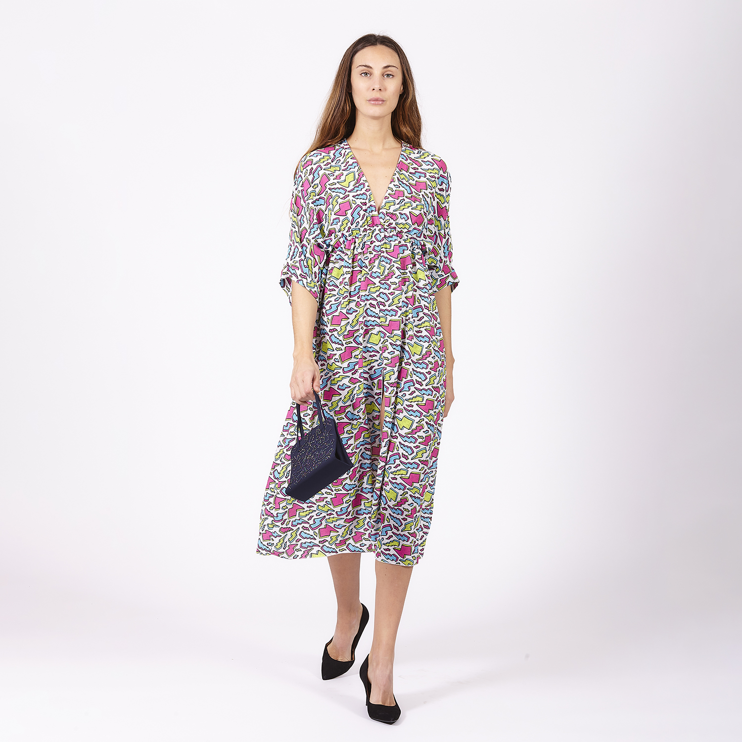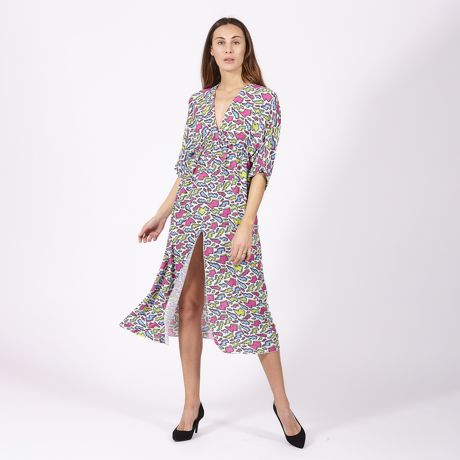 Vestido colorido con estampado de manchas de diferentes colores. Escote triangular y manga francesa. Es largo con una ligera abertura en la parte inferior. Tejido ligero y confortable. No olvides ver toda nuestra colección para completar tu look.