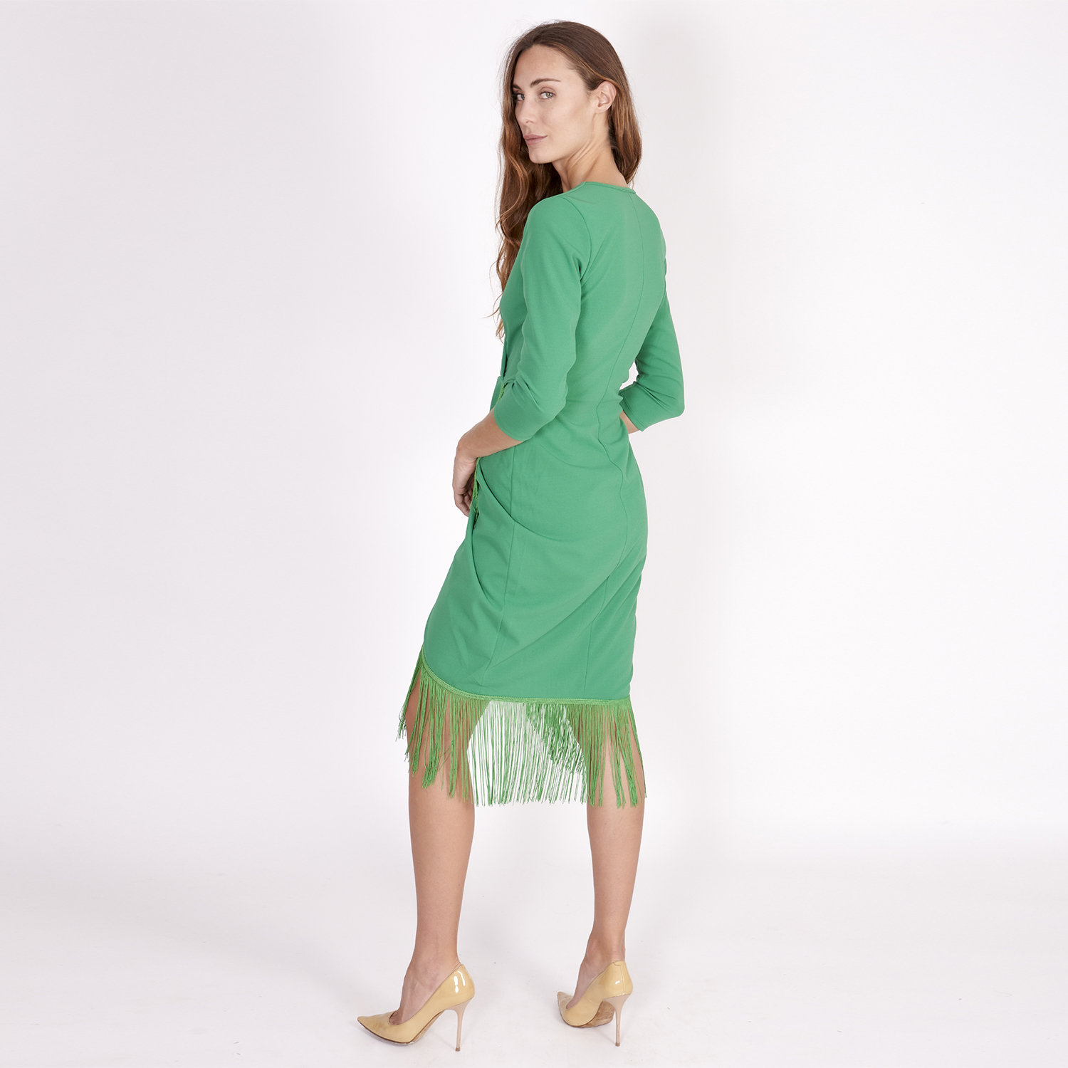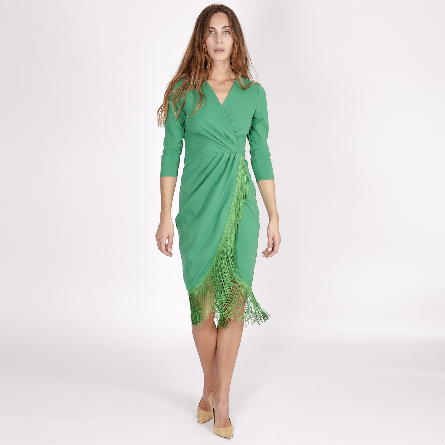 Vestido corto verde. Manga larga por debajo del codo que se ajusta mediante puño. Escote en V. Detalle de cintura con pieza fruncida que realza la figura. Vestido corto y el bajo rematado por flecos del mismo color.