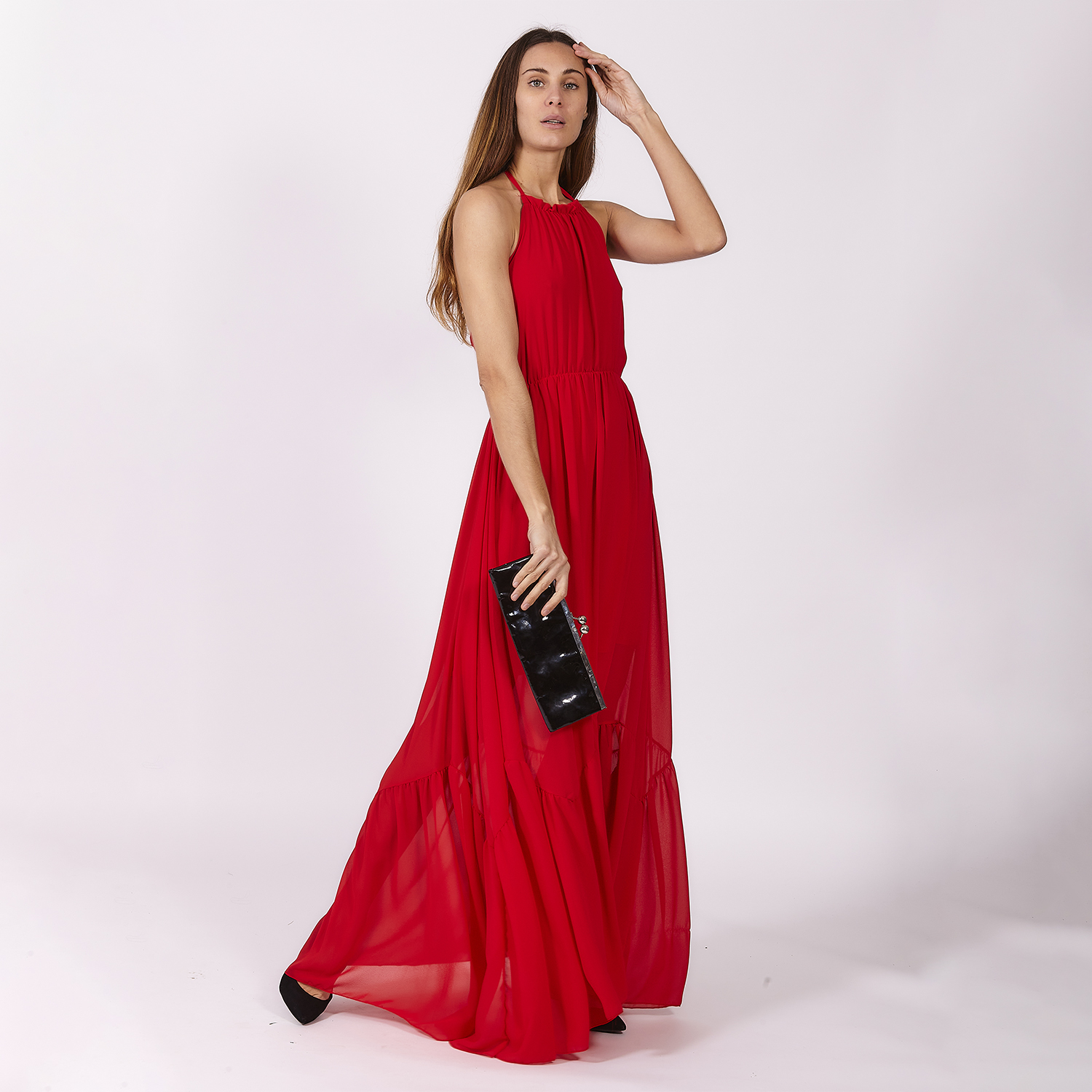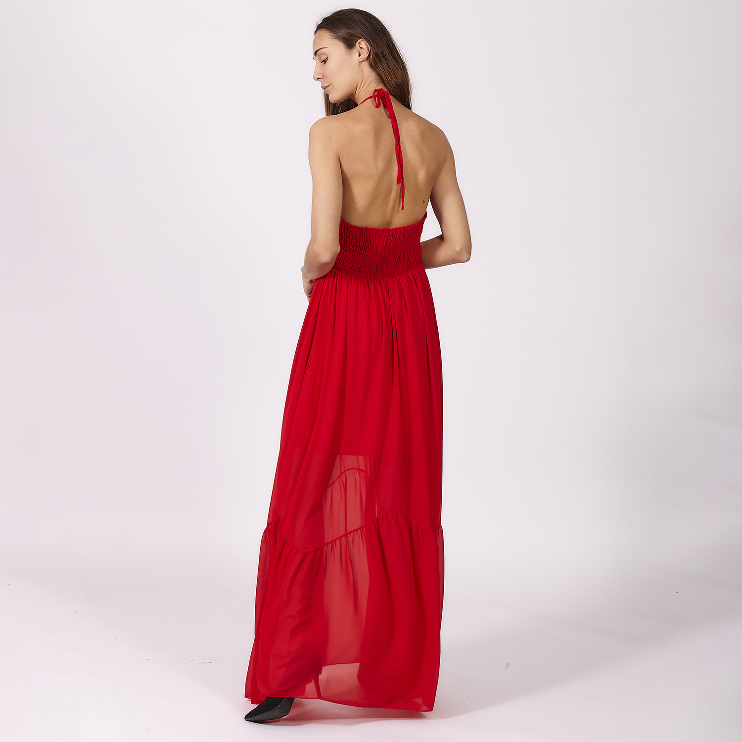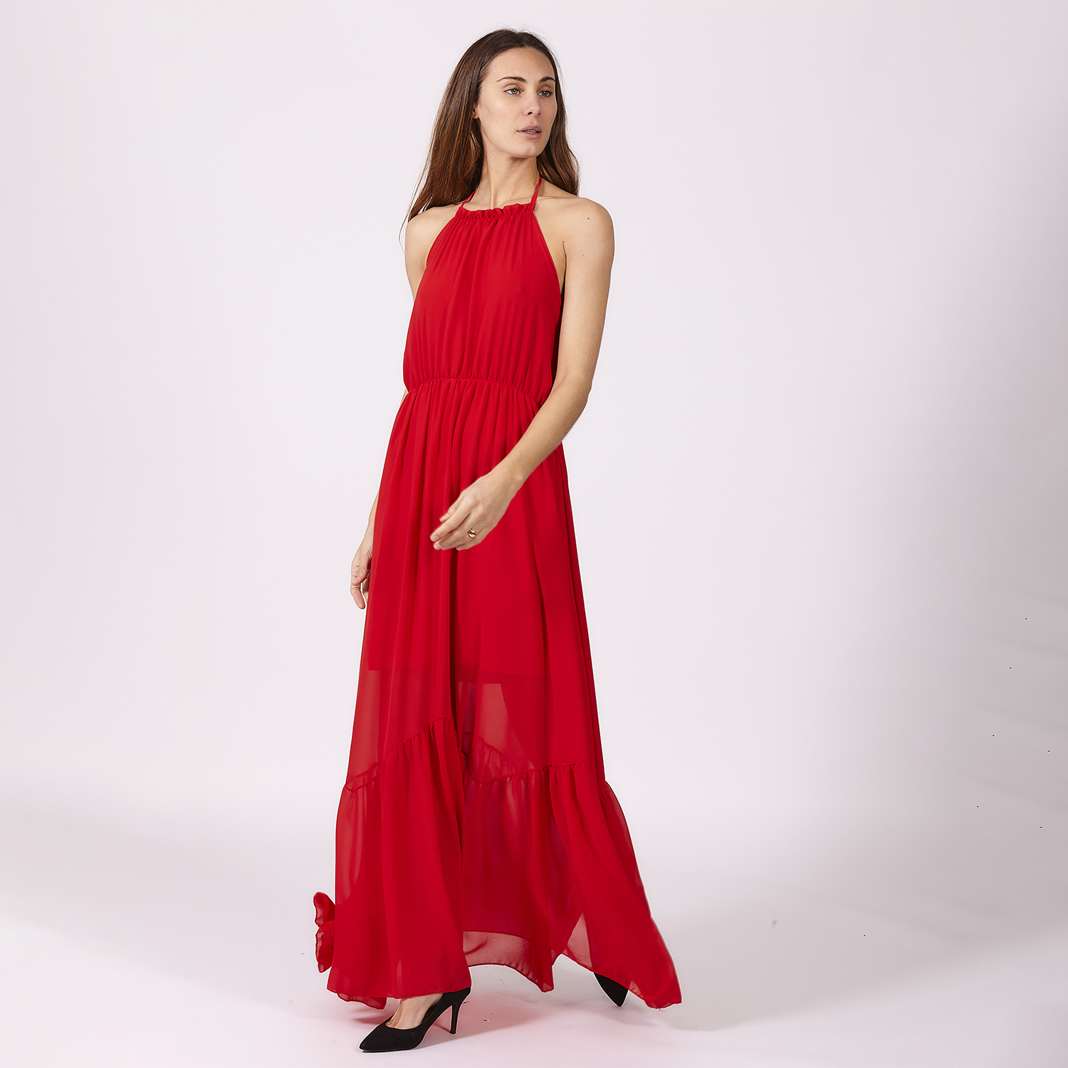 Vestido rojo de corte ceñido al cuello y sin mangas. Es entallado en cintura y se abre en cadera dando una composición abierta. Es un vestido hasta los tobillos que presenta detalles en la zona del pecho. No olvides ver toda nuestra colección para completar tu look.