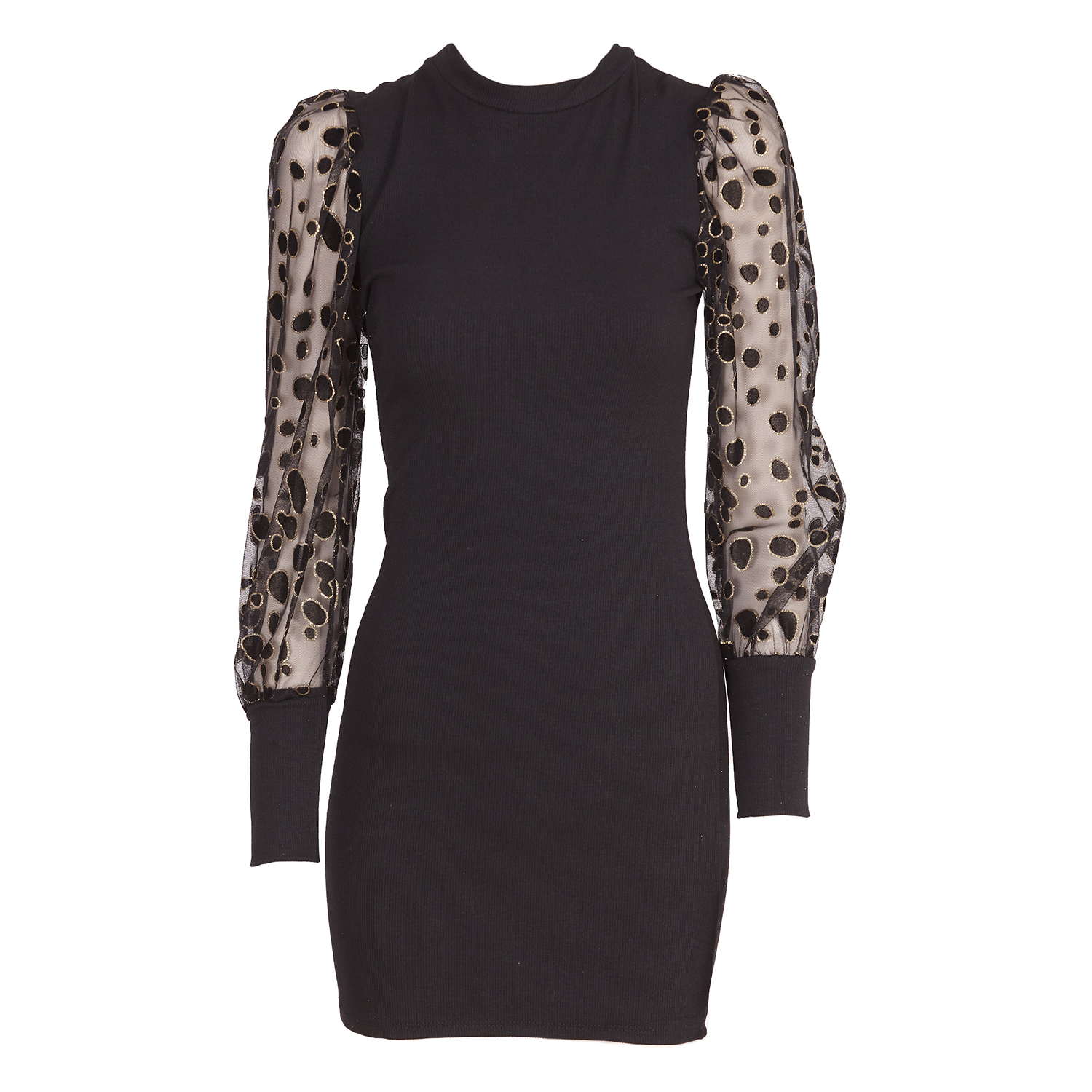 Vestido corto negro de manga larga que presenta diferentes transparencias de tul a lo largo del vestido. composición elegante y juvenil