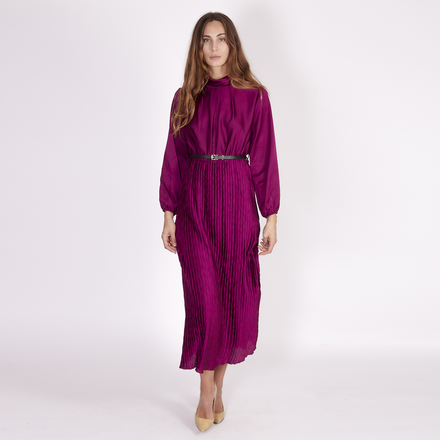 Vestido granate de manga larga hasta la rodilla con un poco de globo en la manga. Silueta que se ciñe a la cintura. diseño limpio y ordenado