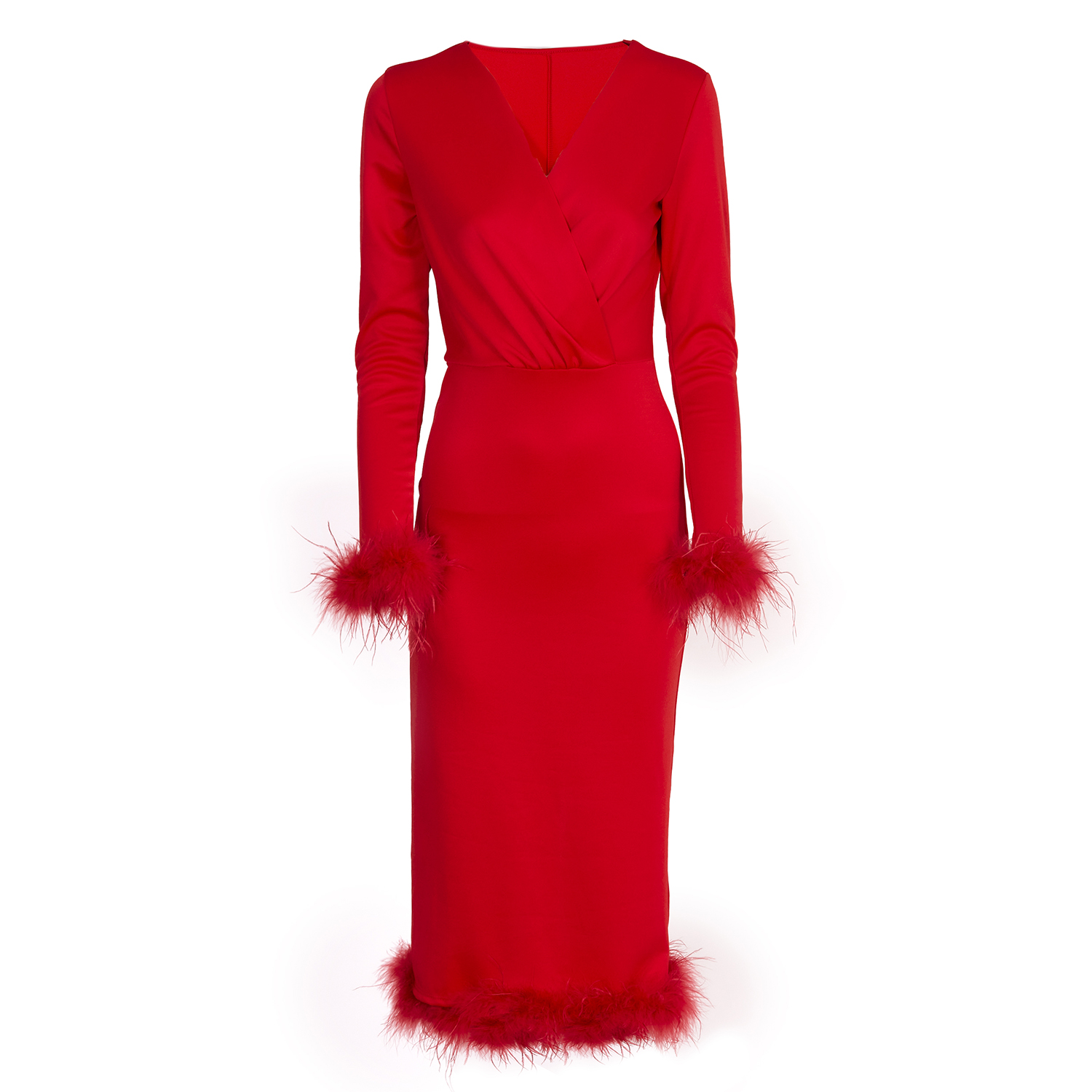 Nuestro vestido más vendido. Vístete por debajo de la rodilla. Llamativo color rojo. Escote en pico y cruzado. Se entalla a la cintura realzando la figura. Acabado en bajo y manga con plumas. Vestido elegante y llamativo. No olvides ver toda nuestra colección para completar tu look.