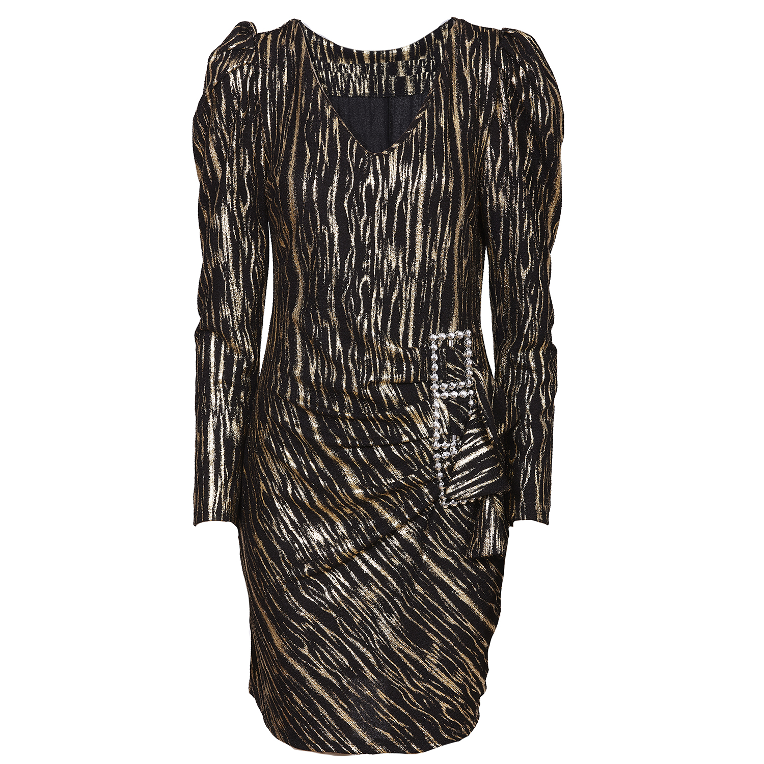 Vestido corto color cobre con mangas voluminosas. Tiene escote triangular. El vestido se entalla a la cintura generando pliegues alrededor del tejido. La falda es corta y tiene cierta caída. Es un vestido elegante y juvenil que además llama la atención. No olvides revisar toda nuestra colección para completar tu pedido.