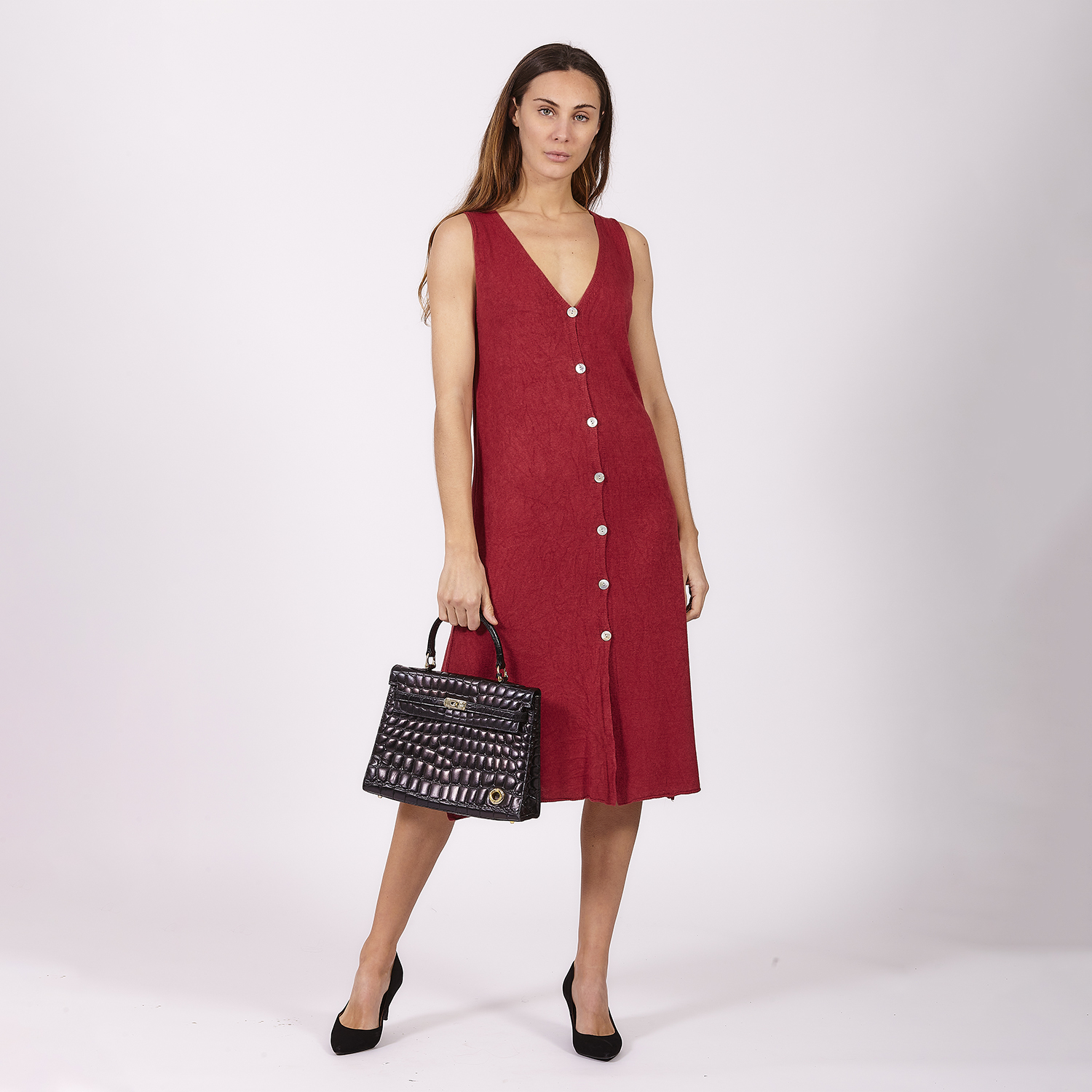 Vestido rojo con mangas, botines y cinturón y por debajo de las rodillas. Un look formal pero fácil de usar para una variedad de ocasiones. La cintura es entallada y el escote cruzado crea un escote en pico. La parte inferior del vestido destaca por el tejido que envuelve el vestido y realza la figura.