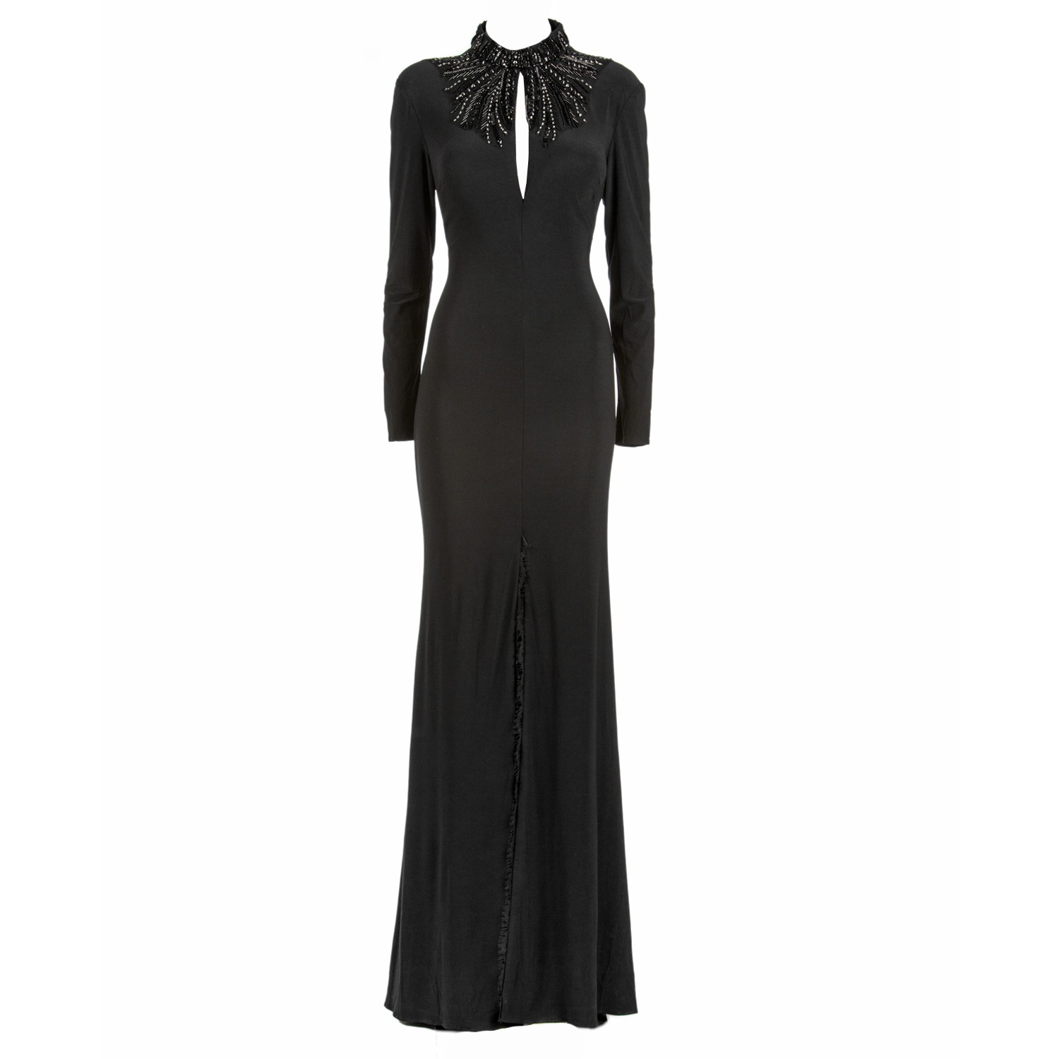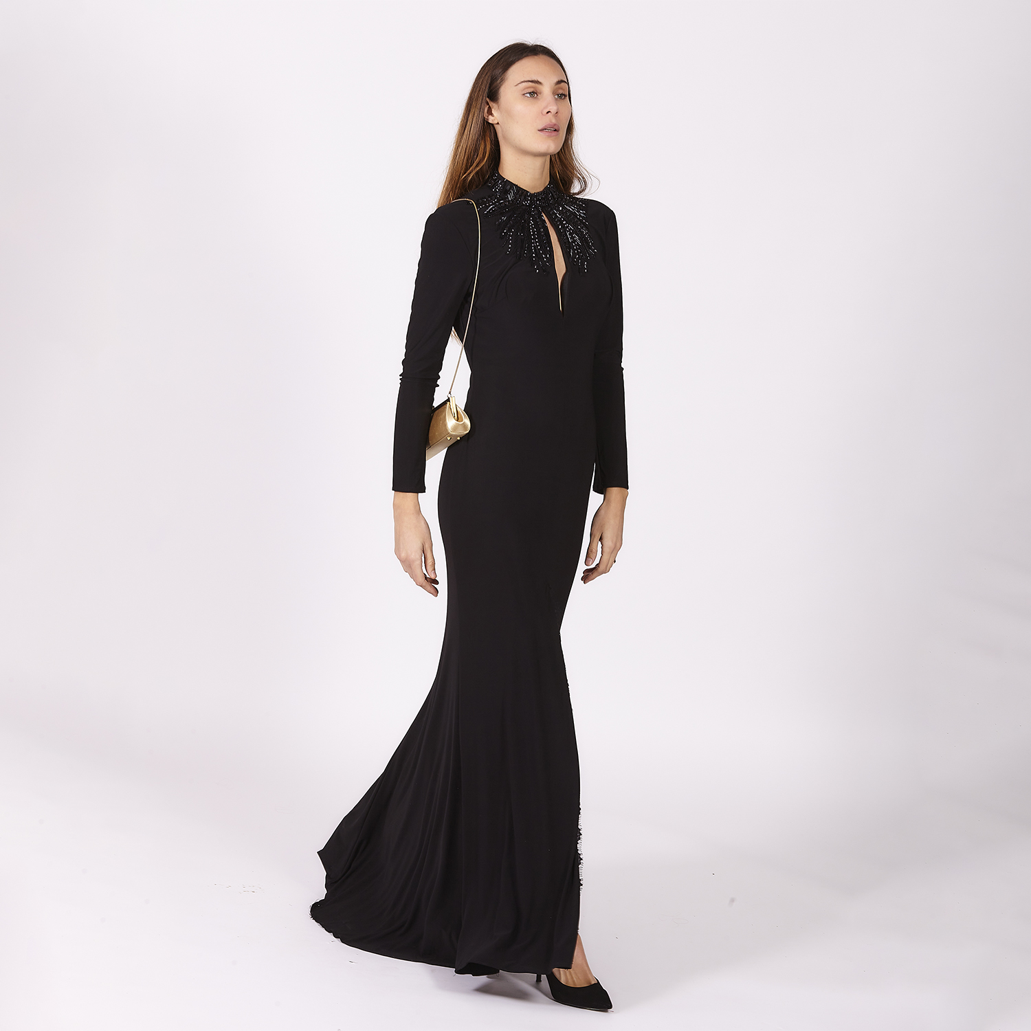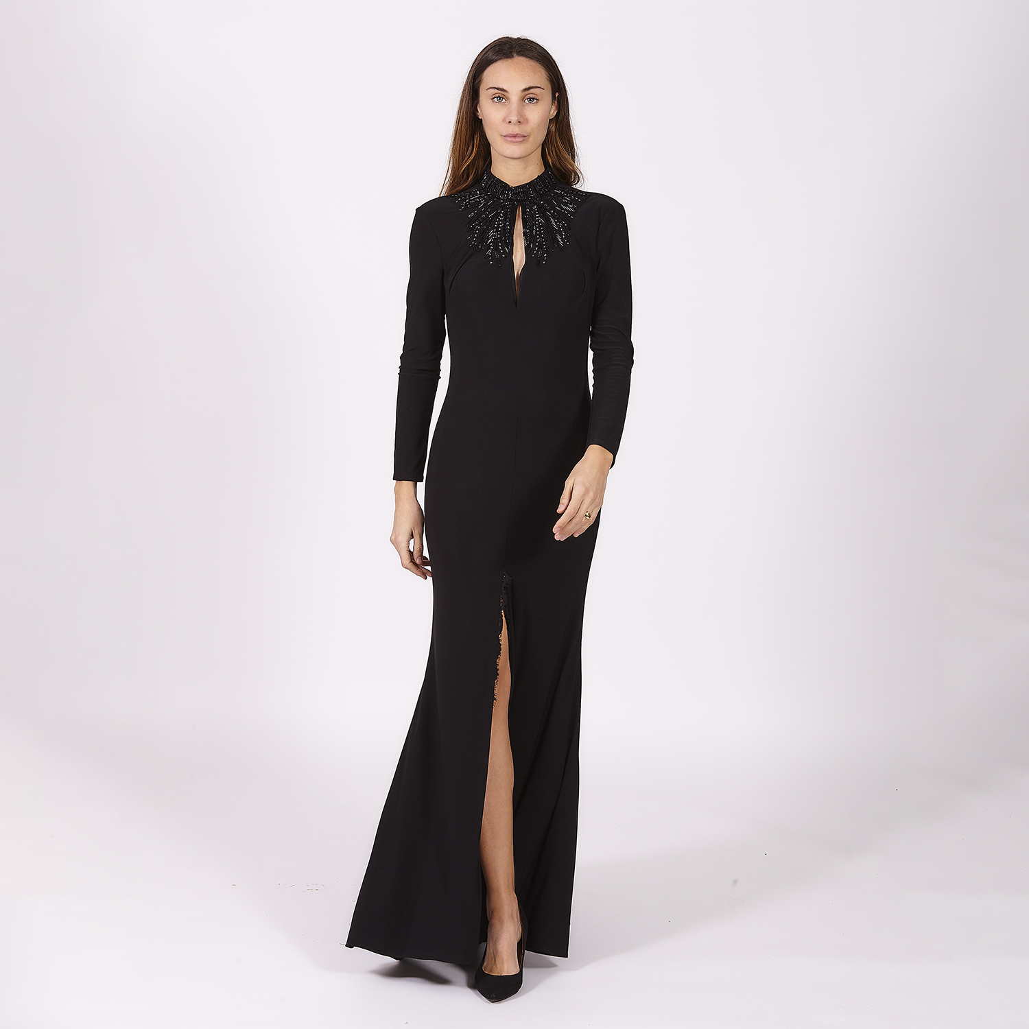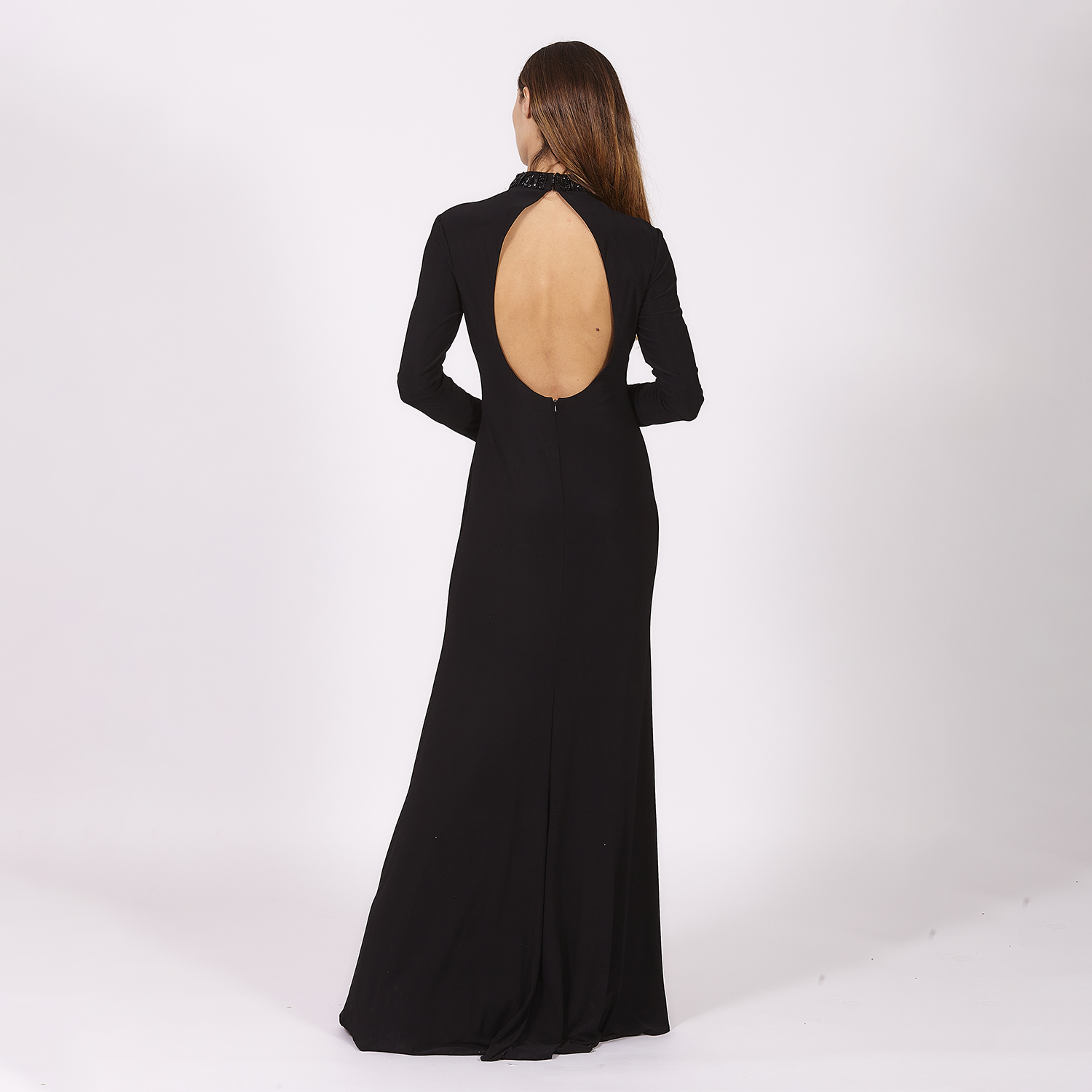 Vestido negro ajustado con cuello cerrado y apertura circular que resalta aún más este increíble vestido que resaltará tu figura y es ideal para ocasiones especiales y lucir increíble con él. Con una altura por debajo de la rodilla te hará lucir aún más elegante y escote en la espalda. No olvides consultar nuestra gama completa de vestidos para completar tu look.