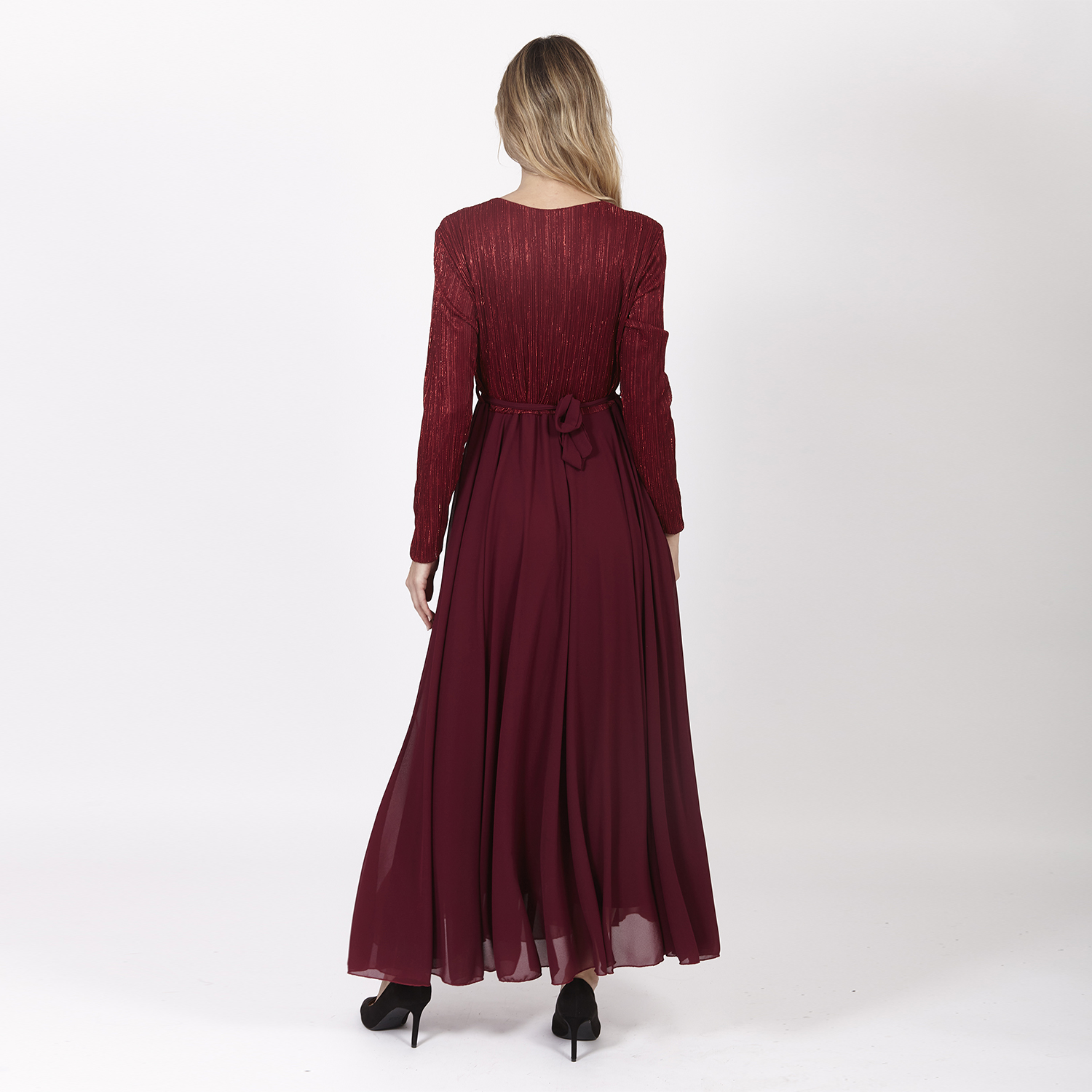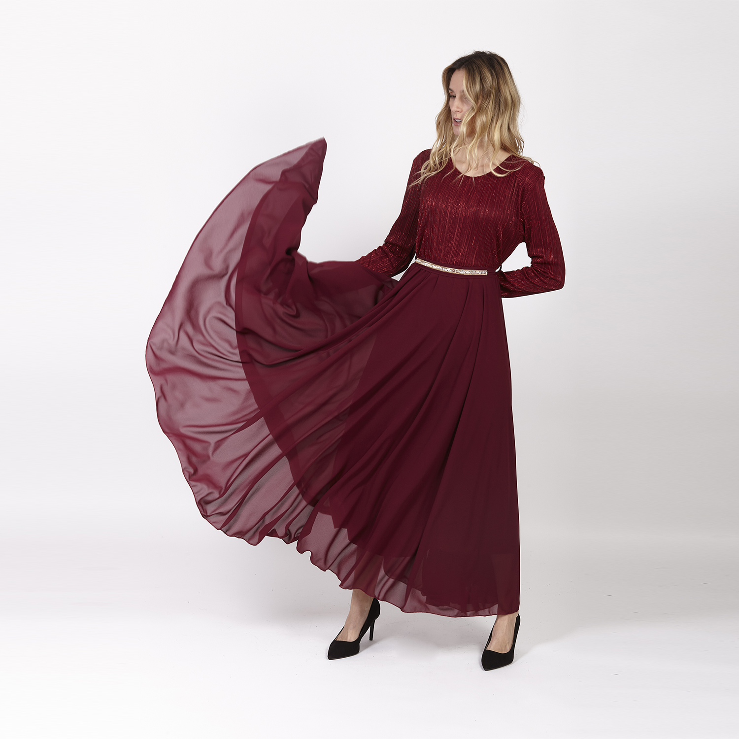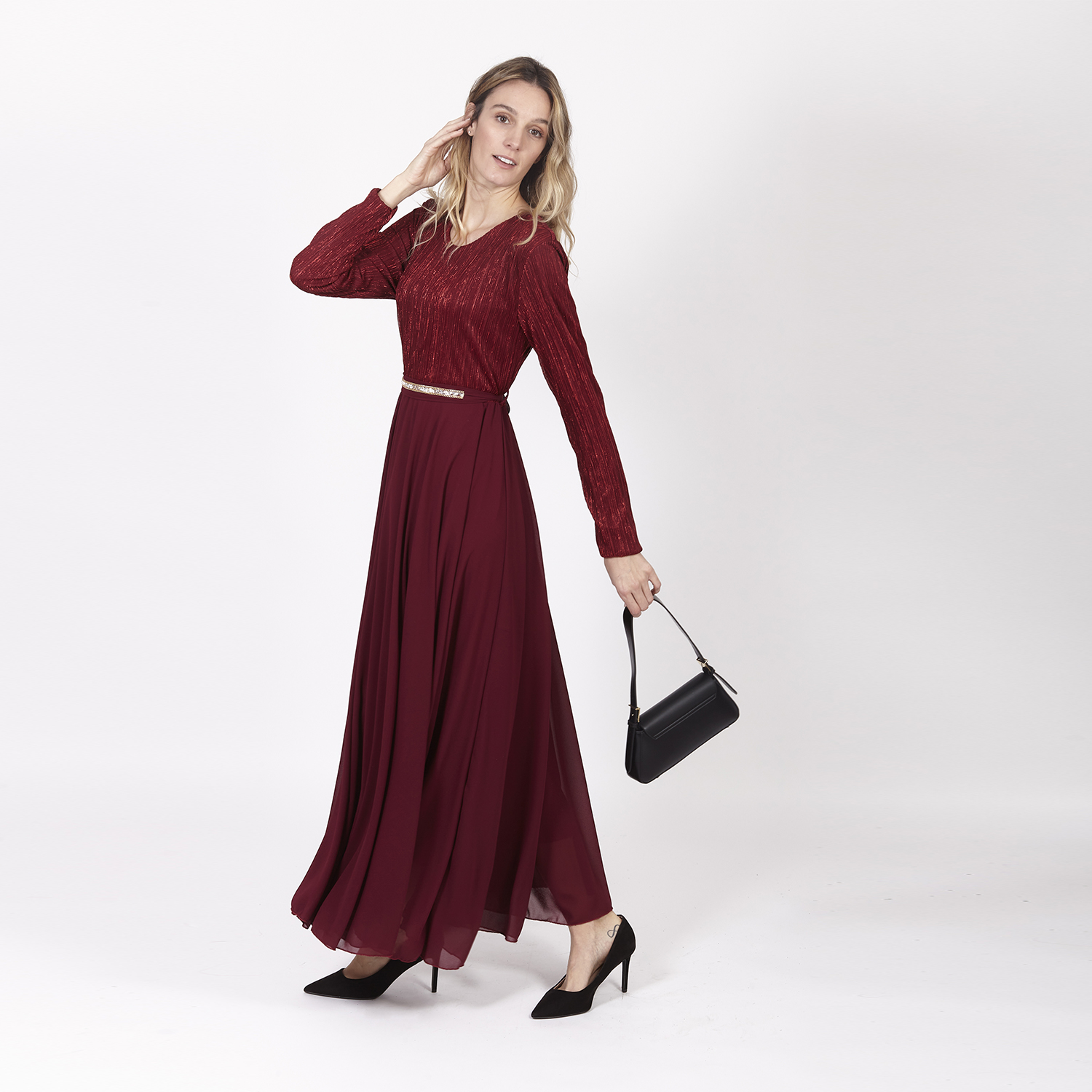 Vestido rojo entallado en cuello y con mangas. Es entallado en la cintura y se abre en la cadera dando una composición libre. Es un vestido tobillero con detalles como el volumen. No olvides ver nuestra colección completa para completar tu look.